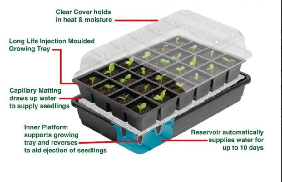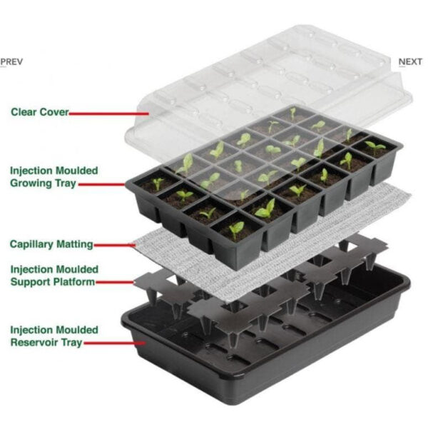 Maintaining optimal growing conditions is essential for successful seed germination. A propagator can help but careful and managed watering is also required. This range of self watering propagators feature an internal water reservoir. The growing trays are supported above the reservoir on raised platforms which are in turn covered in capillary matting. The plants draw the water naturally from the capillary matting as required. This 5 piece set is the perfect size to sit comfortably on a window sill and includes a reservoir tray, support platform, 24 cell growing tray, capillary matting and a clear cover. Each of the growing cells measures 5cm x 4.7cm x 5.8cm deep and has a capacity of 0.1 litres. With the exception of the capillary matting and the clear covers, this unit is made from recycled plastic. The growing tray can be re-used year after year and can be easily sterilised in a dishwasher.