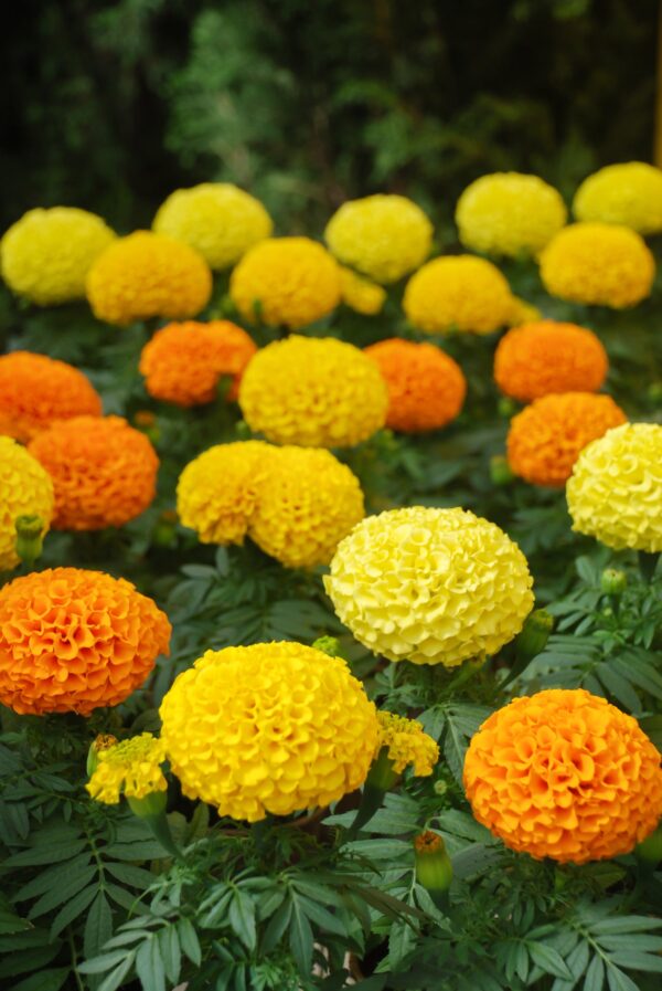 This variety features large, fully double flowers in a mixture of gold, orange and yellow. It is compact, growing to a height of around 35cm, making it ideal for pots.