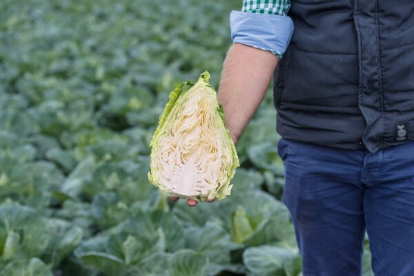 This cabbage is of the Hispi variety, known for its large, pointed head. It is a high-quality type that grows rapidly and stands well at maturity. A Hispi cabbage is characterized by its green leaves and pointed shape.