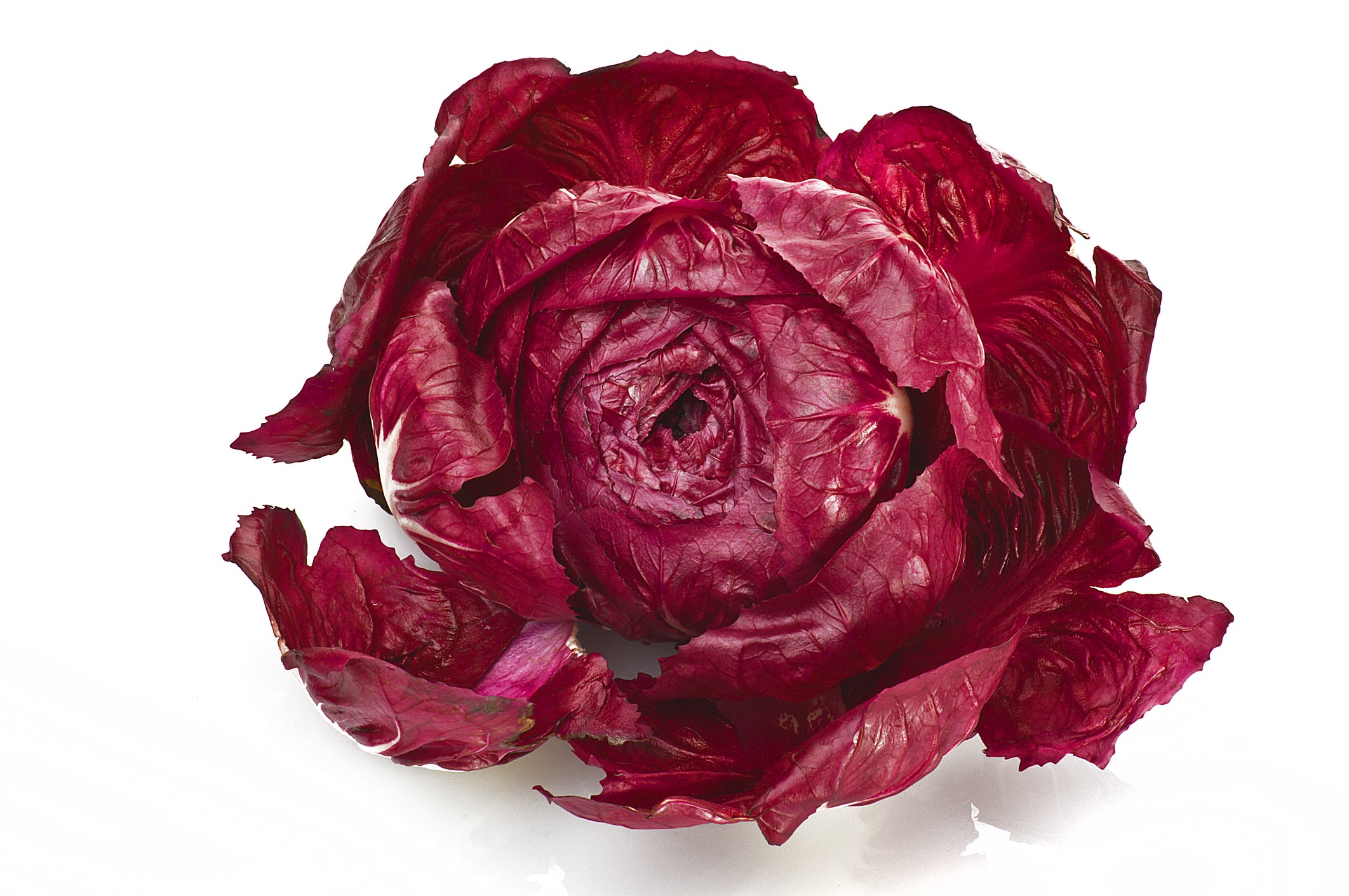 This chicory features barrel-shaped heads of deep red leaves and broad, white ribs.