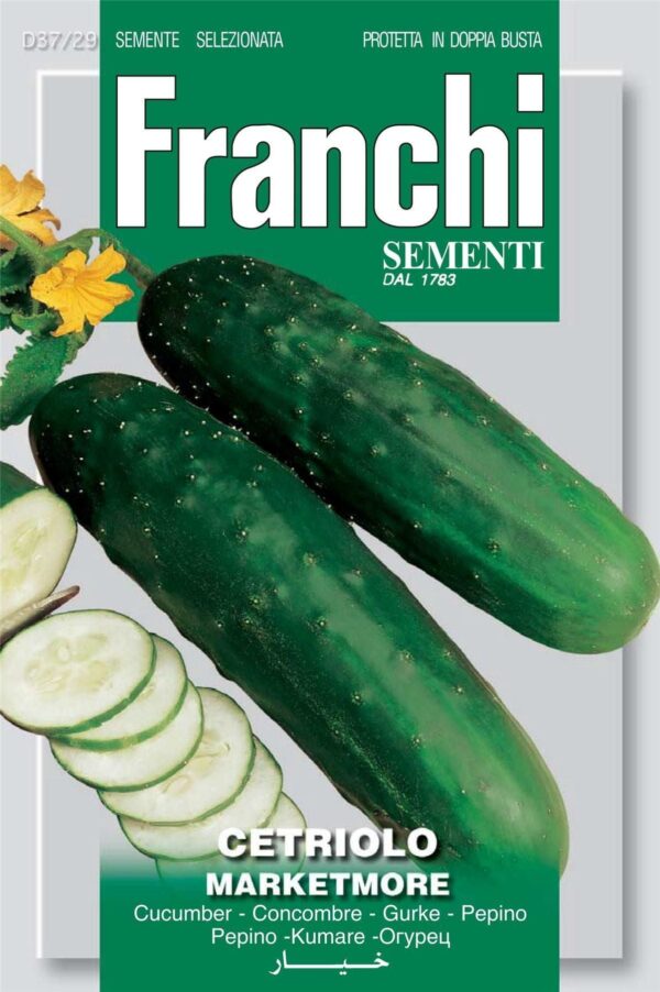 CUCUMBER MARKETMORE Early. Vigorous productive plant, with tightly packed leaves. Dark green cylindrical fruits with very few spines and an intense flavour.