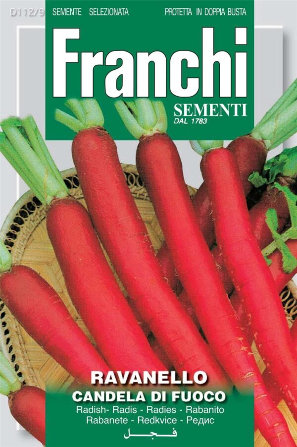 RADISH THE CANDLE OF THE FIRE – Mid early variety, red coned root, crispy and tasty, leafy ad vigorous.