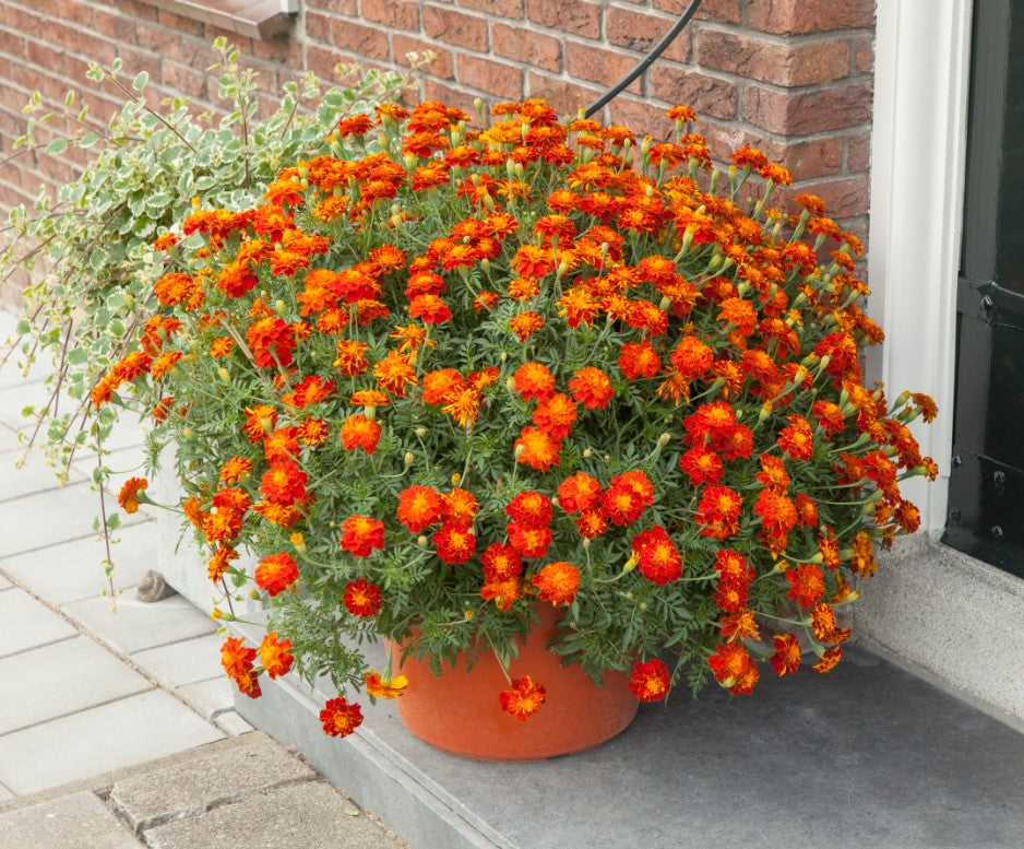 Marigold Firebird will provide you a long lasting display of orange blooms throughout the summer. It has a distinct appearance that is also a beneficial plant for the bees and butterflies. It does best in a sunny spot. A compact plant that does well in patio containers and borders.