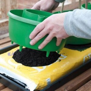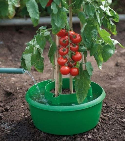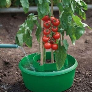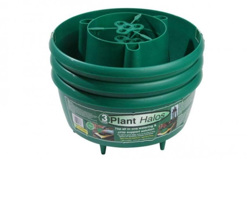 The unique Plant Halos offer an ‘all in one’ watering and crop support solution for popular crops such as tomatoes, peppers and beans. Sold in sets of 3, Plant Halos can be used on grow bags, pots (with a diameter of 26cm and above), raised beds, as well on traditional vegetable plots. The central inner pot creates the planting area which is particularly useful when used with grow bags as it allows a deeper planting zone to develop healthier plants. A 3.1 Litre outer ‘moat’ features six 2.8cm watering spikes which penetrate below the surface, delivering water direct to the plant’s roots. This ensures that water and liquid feed are delivered at a reduced rate that the plant is better able to absorb, preventing wastage which is common with conventional watering. It typically takes between 3 and 6 hours for the water reservoir to drain fully, depending on the weather and soil conditions. Plant Halos also feature a unique cane support system. 3 anchor slots surround the inner pot and provide the means for a rigid, wind resistant structure using bamboo cane (not included). A cane grip cap (see photo below) is also included and allows for up to 4 canes to be joined at the peak of the resulting structure. The cane grip cap is simply separated from the main moulding by the user. Plant Halos are manufactured from recycled, UV stabilised plastic and are guaranteed for 5 years. We offer two colour alternatives – classic green or tomato red.