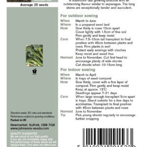 A quality variety with loose heads on tender asparagus-like stems A distinctive fast growing broccoli with an outstanding flavour similar to asparagus. The long stems are exceptionally tender and succulent.