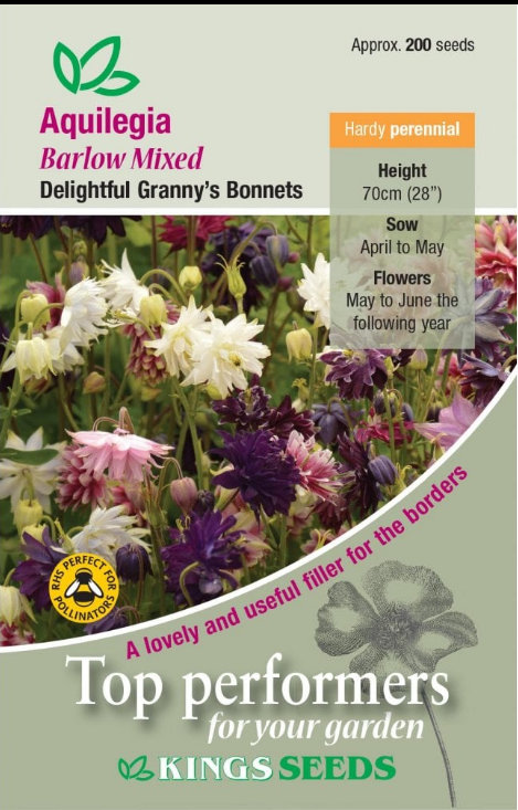 Combinations of blues, violets, pinks and partly white edged Granny’s Bonnets. Height: 70cm Hardy Perennial.