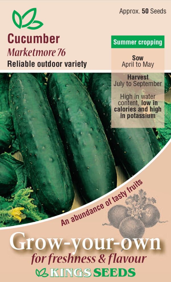 Kings Seeds – Vegetable – Cucumber Marketmore 76 :- This is a reliable and productive outdoor ridge Cucumber. Thick dark green fruits up to 20cm in length with small white spines and produced in abundance.