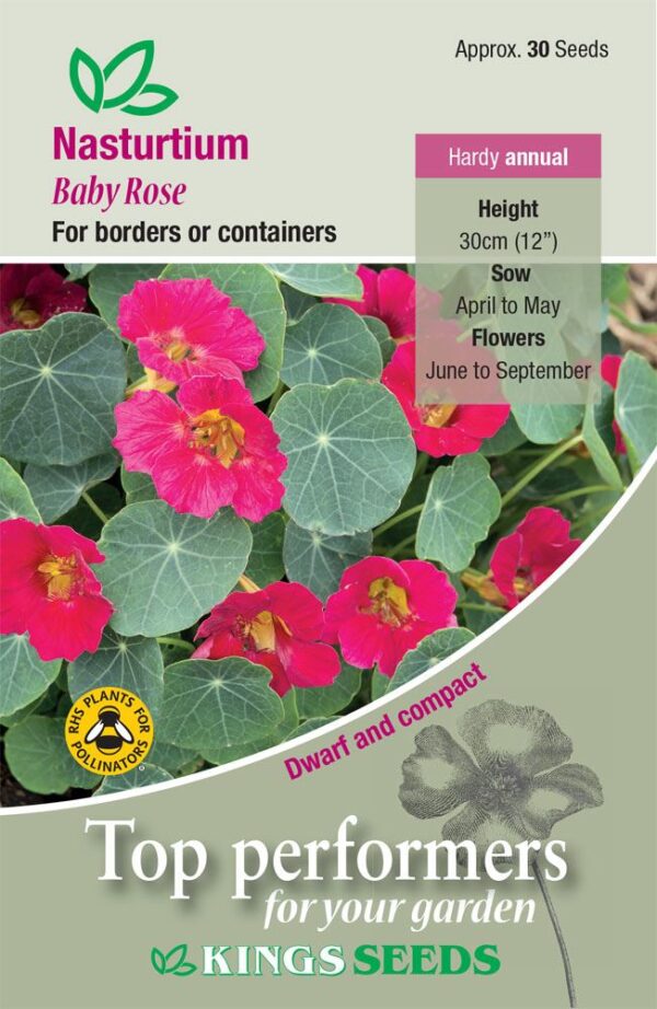 Kings Seeds – Flower – Nasturtium Baby Rose :- Compact, mounding small dark green leaves, become small deep rose flowers. Dwarf enough for use as a bedding plant and the first choice for growing in container.