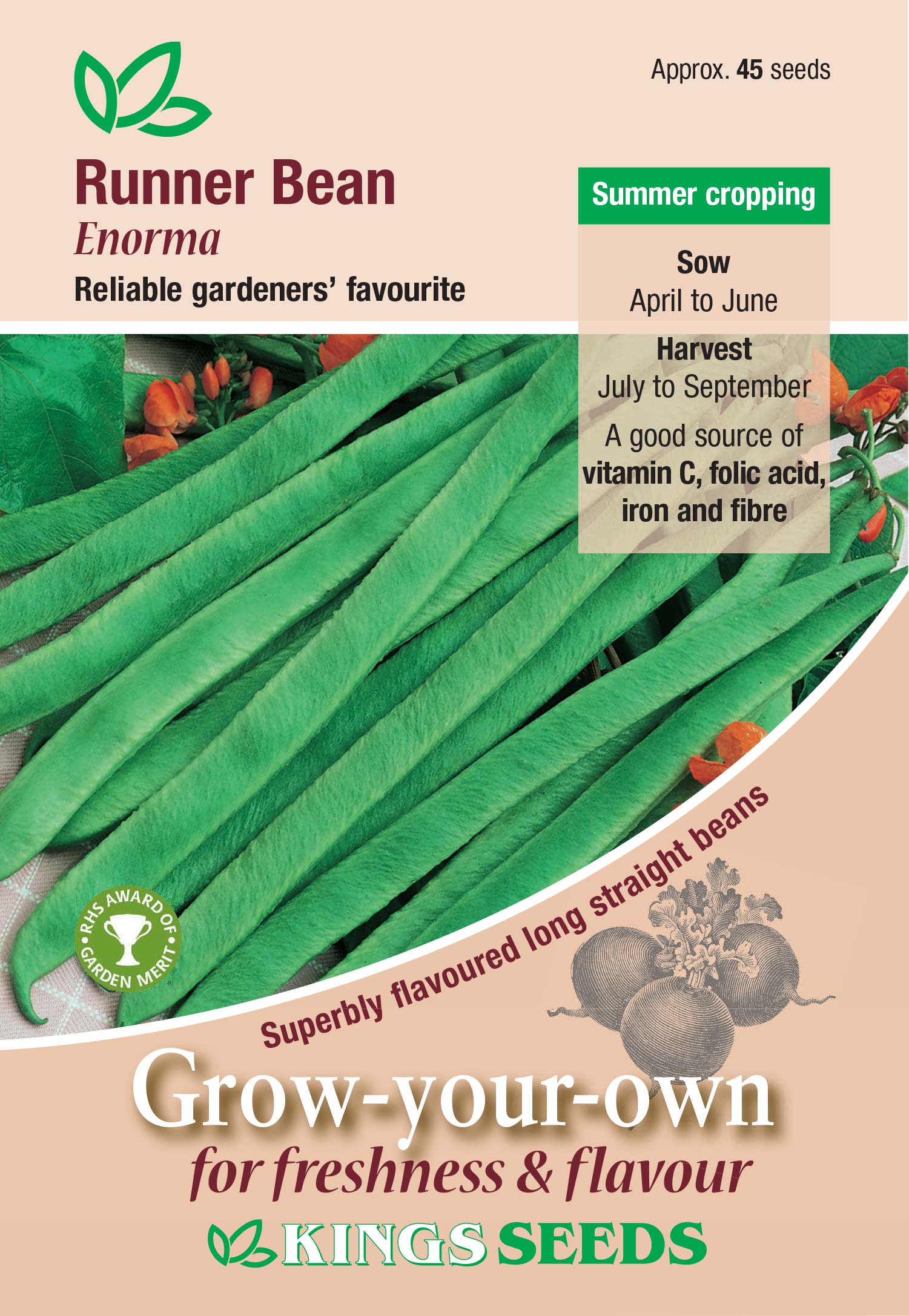Enorma is a very heavy cropper which makes it the commercial and garden favourite. The strong growing runner bean plants produce long, slender pods with superb flavour and makes for a good exhibition choice.