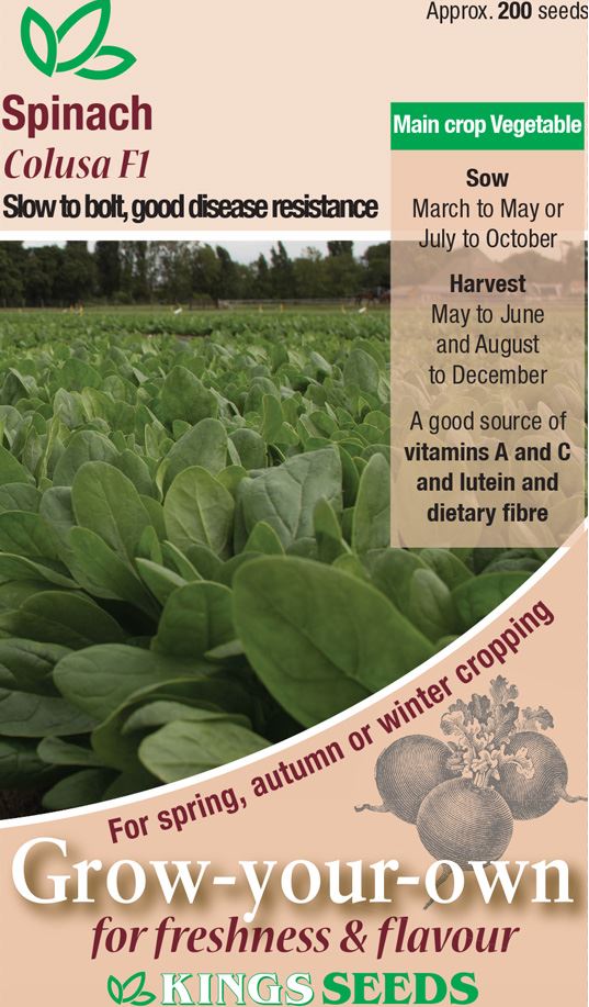 Kings Seeds – Vegetable – Spinach Colusa F1 :- This spinach hass a smooth leaf with a high resistance level against downy mildew for races Pe.1-18. The smooth medium green leaves have a round-oblong shape.