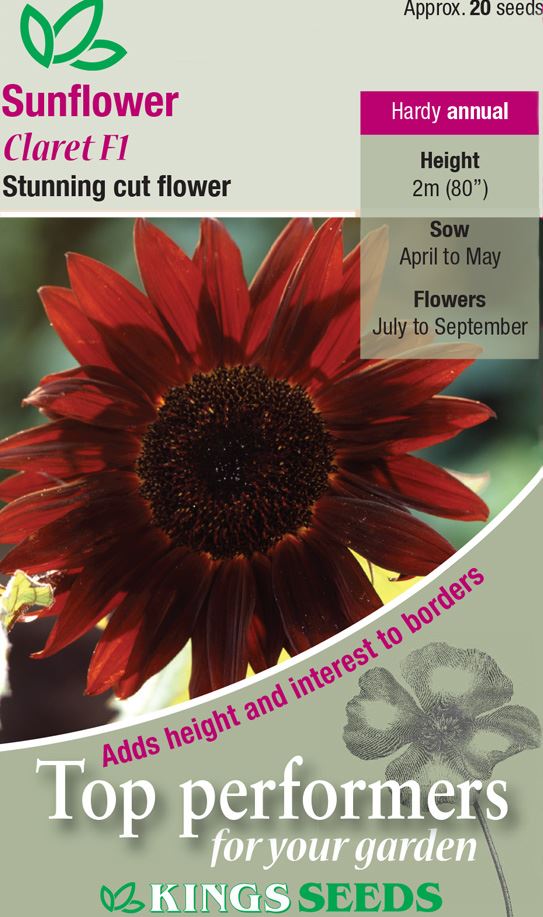 Kings Seeds – Flower – Sunflower Claret F1 :- Stunning deep red sunflower blooms resembling the late evening sun. As they mature they develop a gorgeous metallic sheen. Position in full sun, preferably in a position sheltered from winds. Hardy Annual Height: 2m (80cm)