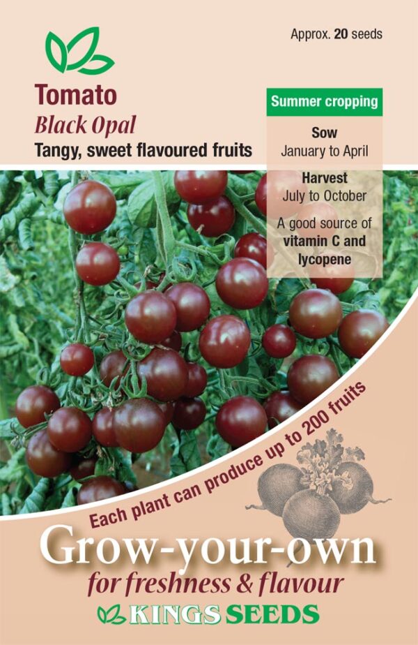 Tomato Black opal is a dark chocolate coloured cherry tomato. It has a tangy yet sweet flavour and excellent texture. The small fruits are borne on long, branched trusses and can produce approximately 150 to 200 fruits per plant in an average growing season. Shows good disease tolerance. This is an indeterminate cordon type.