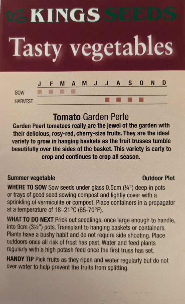 Tomato Garden Pearl is the jewel of the garden with its delicious, rosy-red, cherry-size fruits. They are the ideal variety to grow in hanging baskets as the fruit trusses tumble beautifully over the sides of the basket. This variety is early to crop and continues to crop all season.