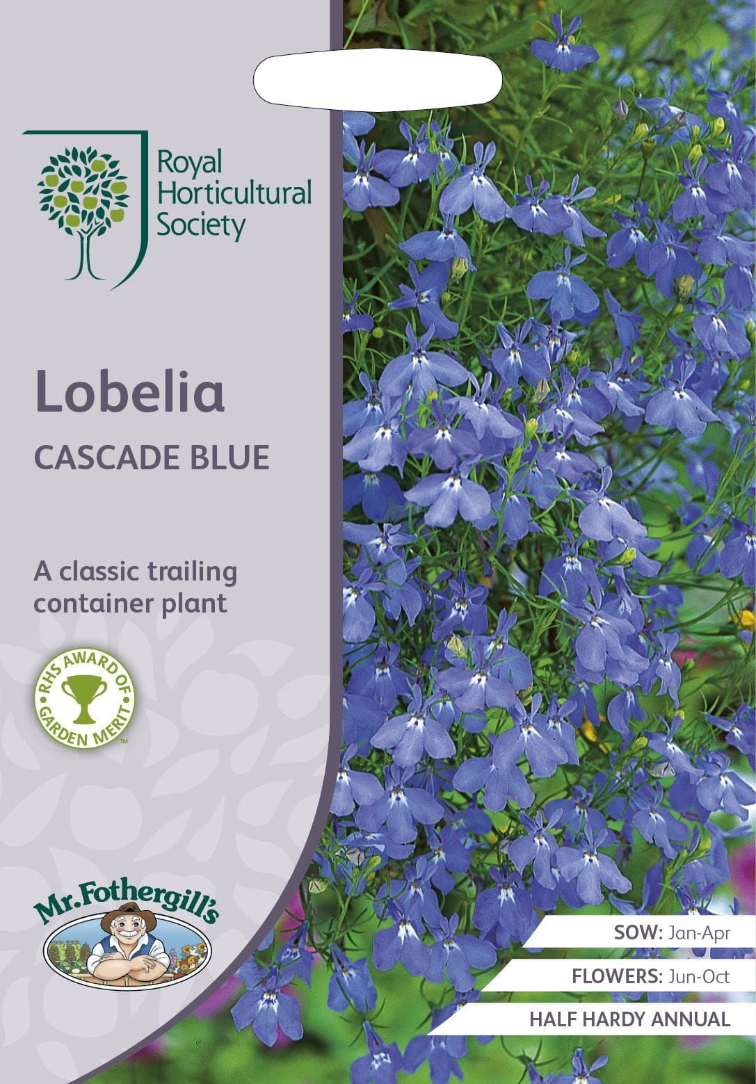 A mass of vivid little blue flowers appear profusely over a long season. The vigorous trailing plants are the perfect choice for container and basket displays. Winner of an Royal Horticultural Society, Award of Garden Merit for reliability and good performance, it’s part of the seed range produced by Mr Fothergill�s Seeds in partnership with the RHS.�