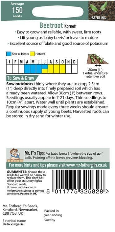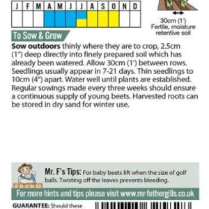 Sow outdoors: April – July, thinly where they are to crop, 2.5cm(1â€) deep directly into finely prepared soil which has already been watered. Allow 30cm(1’) between rows. Seedlings usually appear in 7-21 days. Thin seedlings to 10cm(4â€) apart. Water well until plants are established. Regular sowings made every three weeks should ensure a continuous supply of young beets. Harvested roots can be stored in dry sand for winter use.