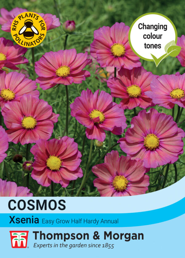 An incredibly stunning range of cosmos! Its petals shine with a vivid pink hue under the full sun, and as the day transitions to evening or on cloudy days, the orange shades become more vibrant, creating the illusion of blooms that change colour. Absolutely breathtaking!
