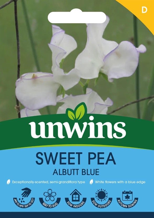Unwins Sweet Pea Albutt Blue Seeds offer an exceptional fragrance with white blossoms framed by subtle blue edges.