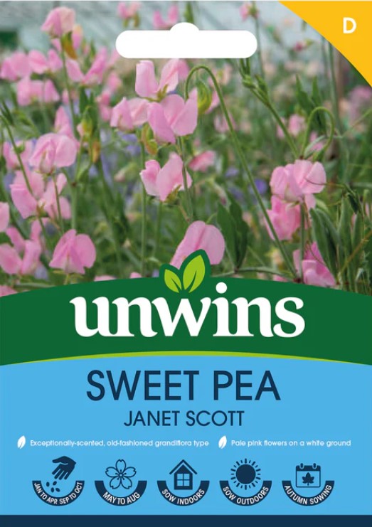 This Unwins Flower Sweet Pea Janet Scott variety produces beautiful, aromatic flowers with a delicate combination of white and pale pink colors. As a grandiflora type, it is perfect for summer gardens and makes an excellent cutting flower.