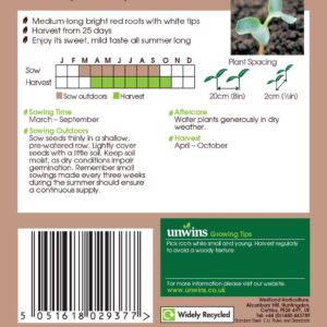 Lovely French Breakfast variety which is very fast maturing. Possesses a mild yet sweet flavour for harvests from spring right through to autumn.